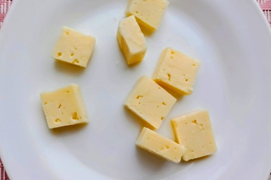 - Taiati cascavalul in cubulete mici. Dimensiunea este de aproximativ 1,5 x 1,5 cm. In total trebuie sa obtineti 8 cubulete.