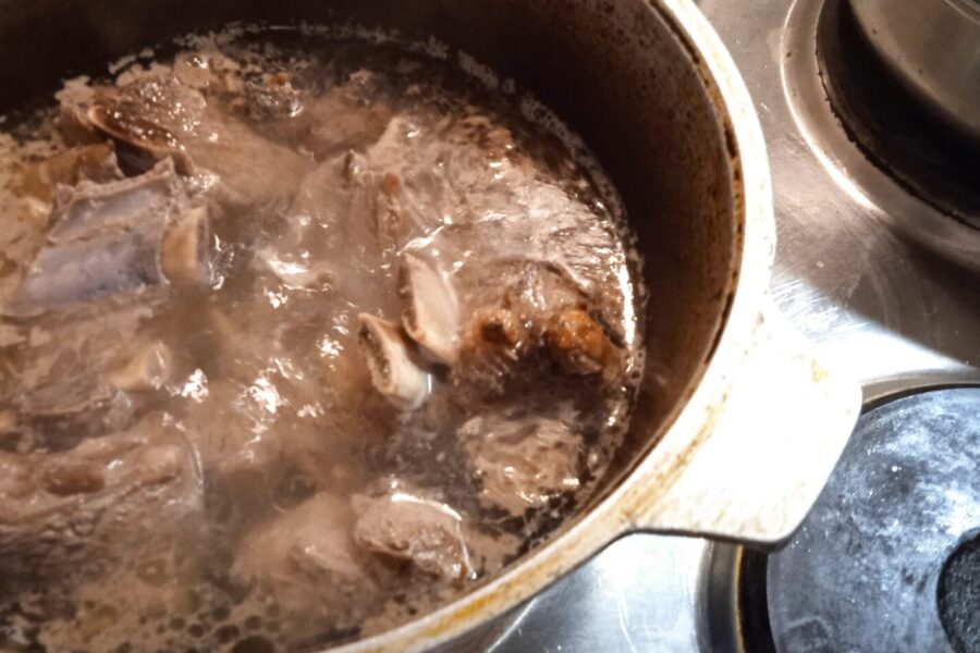 - În timp ce eram ocupați cu legumele, carnea era înăbușită. Se separă carnea de oase și se întoarce la ceaun.