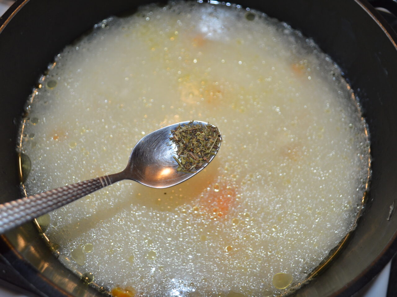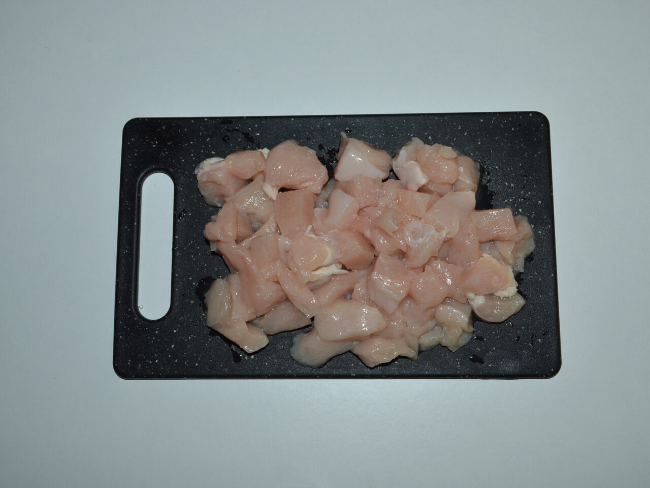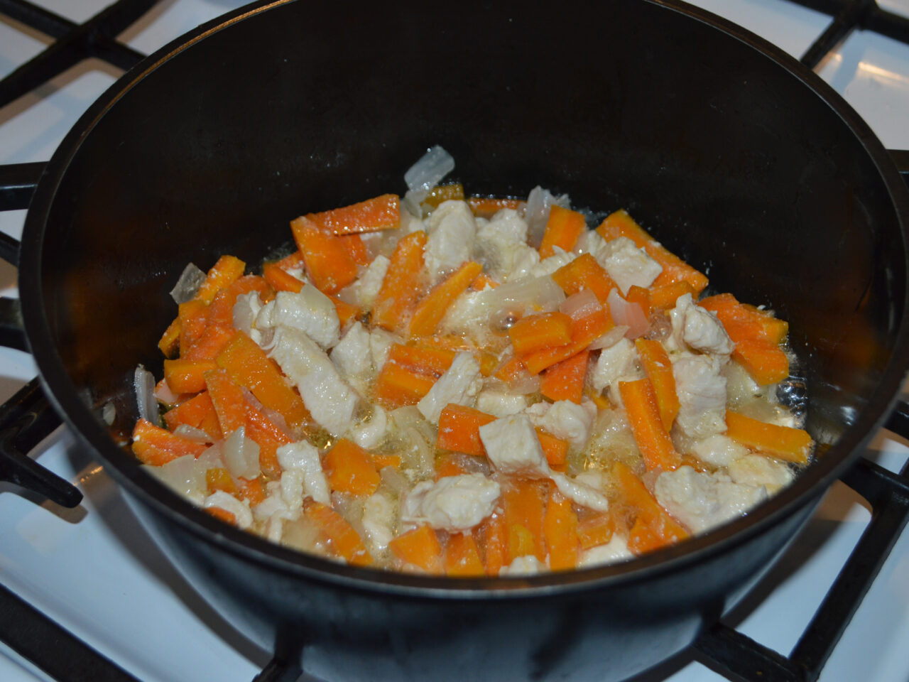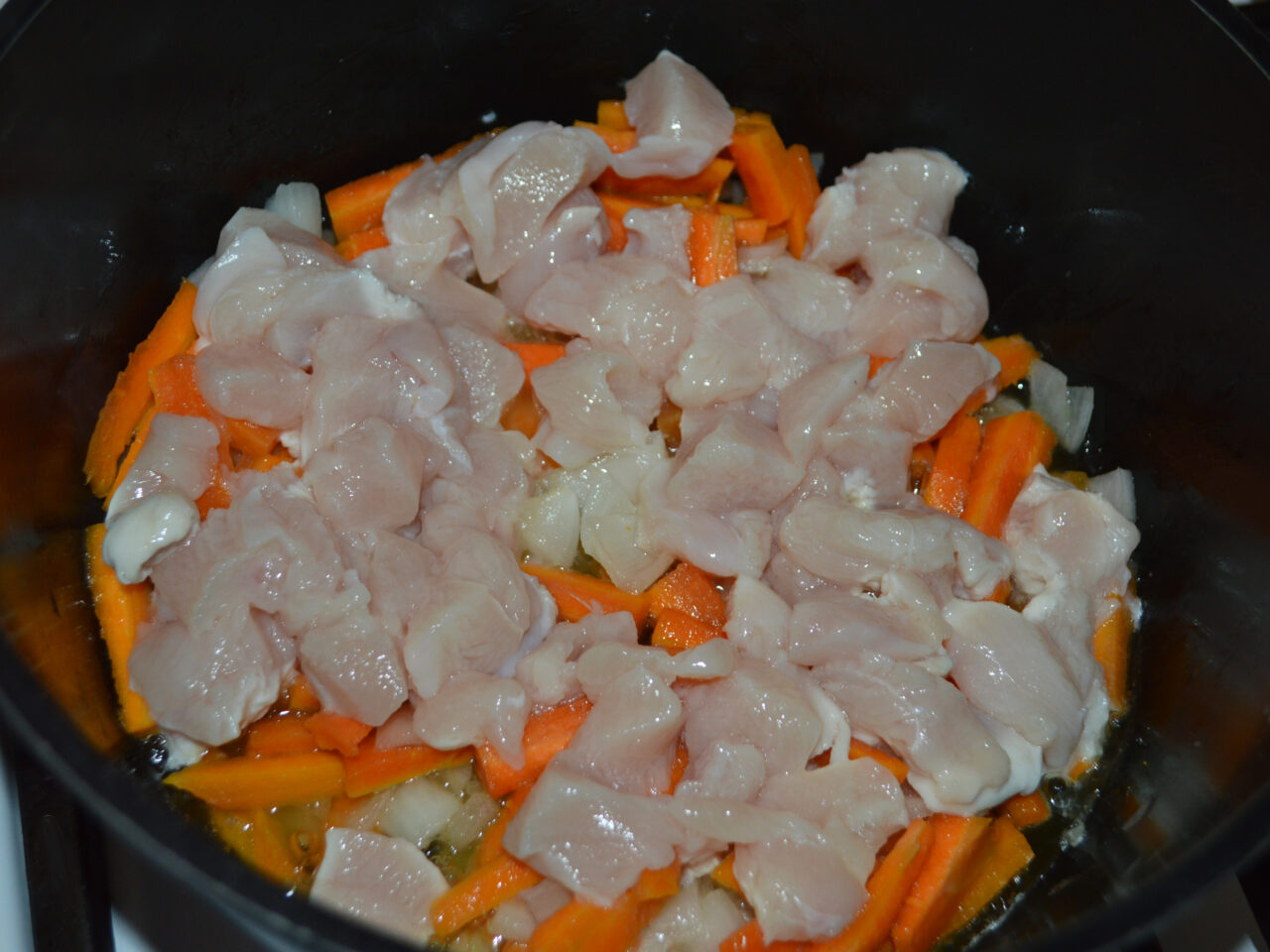 - Dupa 2-3 minute, adaugati si pieptul de pui in ceaun.