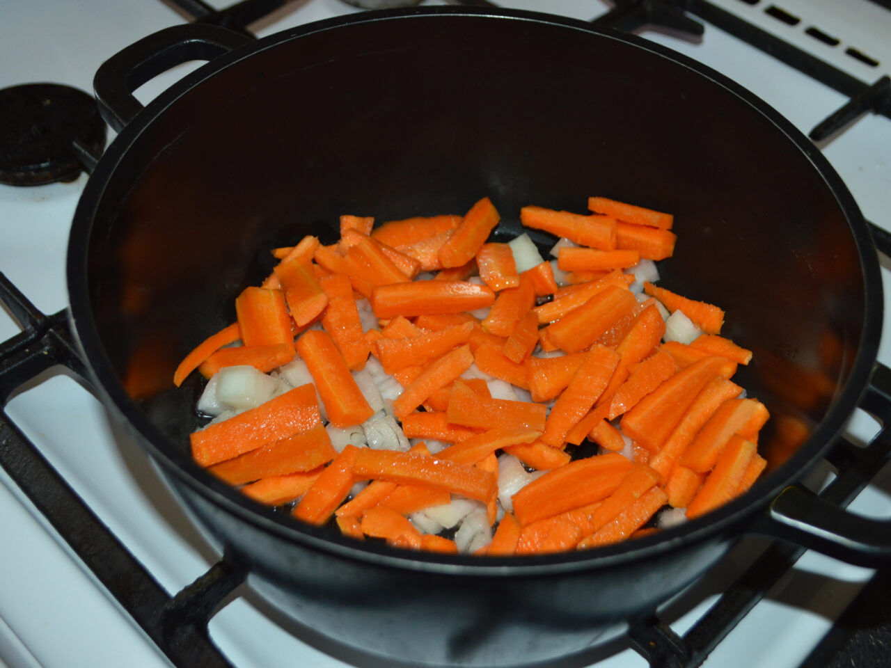 - Turnati putin ulei intr-un ceaun, si porniti aragazul la foc mic. Dupa ce uleiul s-a incins, adaugati in ceaun ceapa si morcovul.
