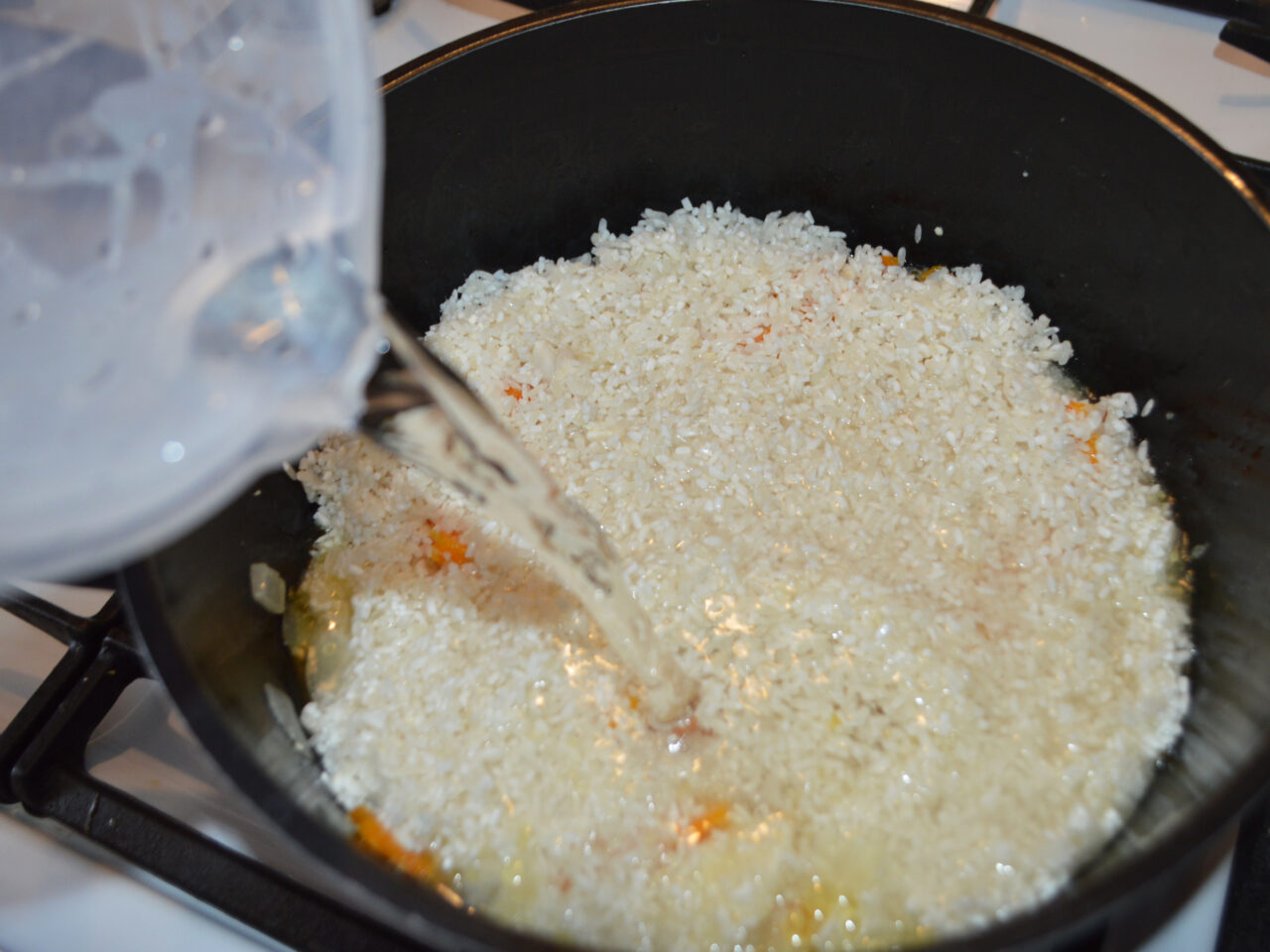 - Adaugati orezul in ceaun, si turnati un litru de apa.