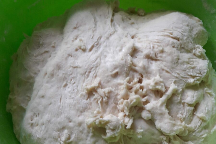 - Prepararea aluatului: adăugați drojdia și zahărul în apa călduță (1 pahar) și frământați cu un tel până la omogenizare. Se toarnă apoi sarea, o parte din făină și uleiul de floarea-soarelui. Se frământă aluatul. La final adăugați un pahar de apă clocotită în aluat și frământați-l din nou. Adăugați făina. Când aluatul devine tare, îl puteți frământa cu mâinile.