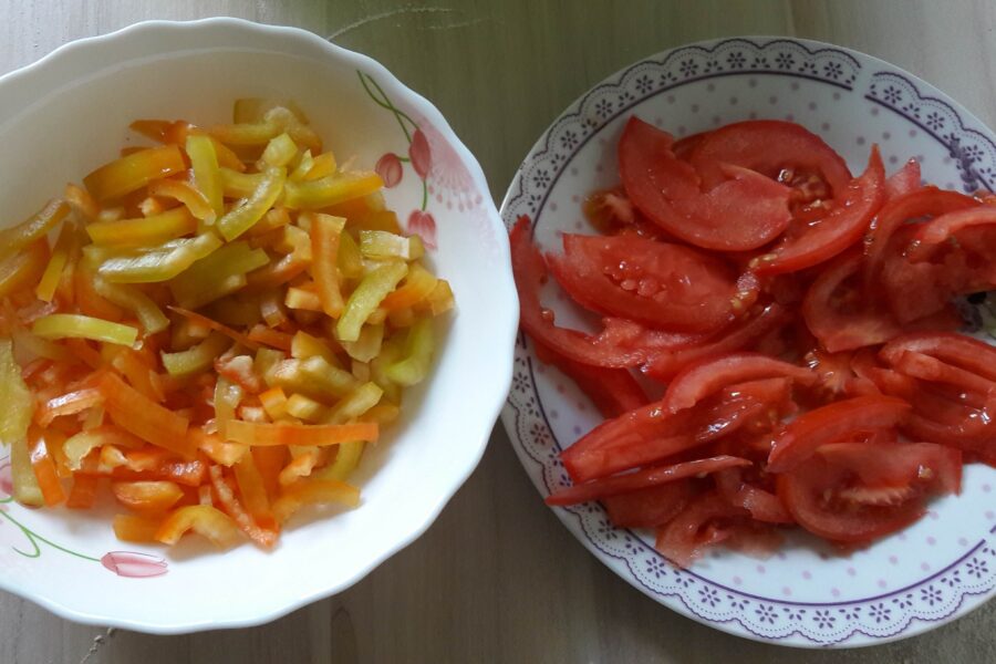 - De asemenea, tăiati roșiile, ardeii dulci si ierburile aromatice. Radeti cascavalul pe o răzătoare grosieră.