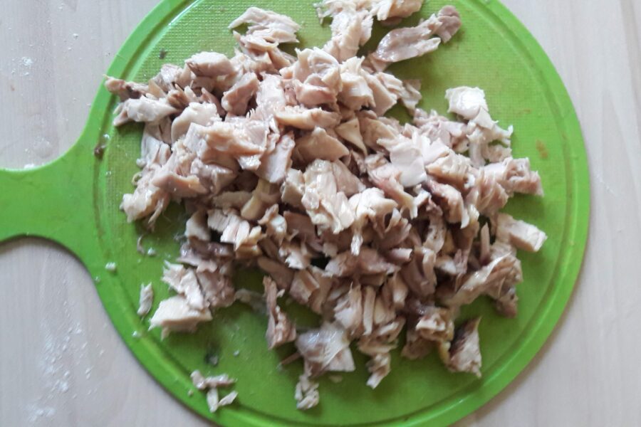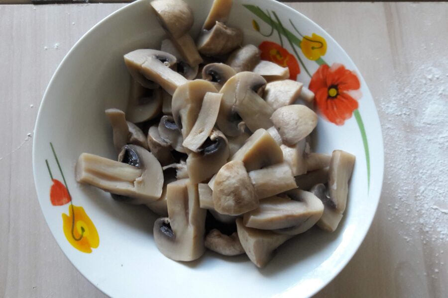 - Fierbeti în prealabil puiul și ciupercile timp de aproximativ 20 de minute.