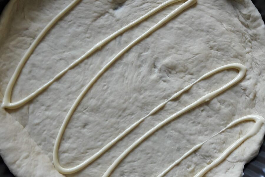 - Asamblarea pizza. Rămâne ultimul și cel mai important pas, asamblarea întregii pizza și trimiterea ei la cuptor. Aluatul s-a odihnit într-un loc cald. Îl mai frământati o dată cu mâinile pe masă, dacă este necesar adaugati făină. Îl împartiti în 4 părți egale. Fiecare dintre părți le întindeti pe masă, ar trebui să obțineți un cerc de aceeași mărime ca și forma noastră, în care vom coace pizza. Se pune aluatul în formă, se unge cu maioneză și ketchup.