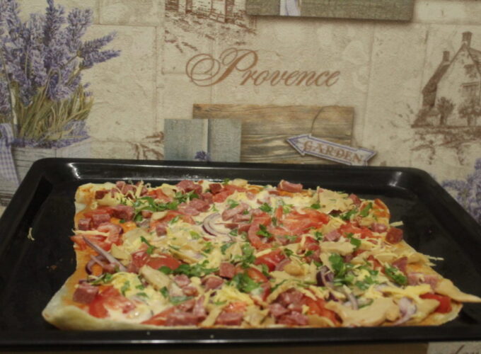 - Peste pizza se toarnă amestecul de ou bătut-maioneză și se dă la cuptorul încins pentru o jumătate de oră.