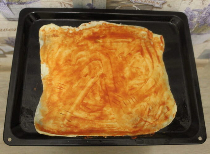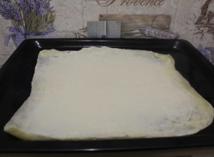 - Dezghețați aluatul înghețat, rulați-l subțire într-un strat și puneți-l pe o foaie de copt unsă.
