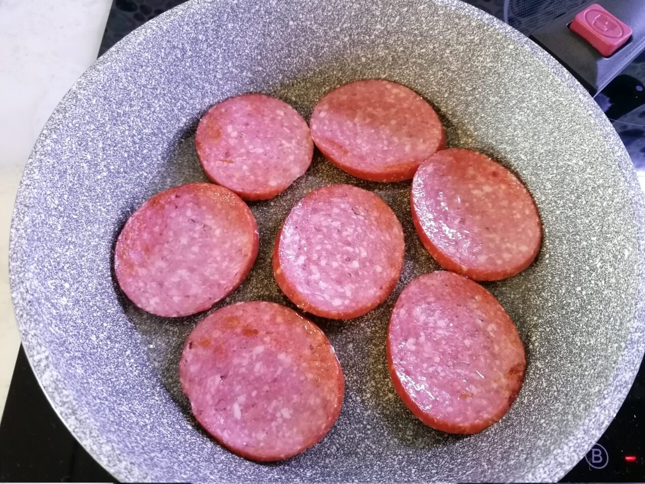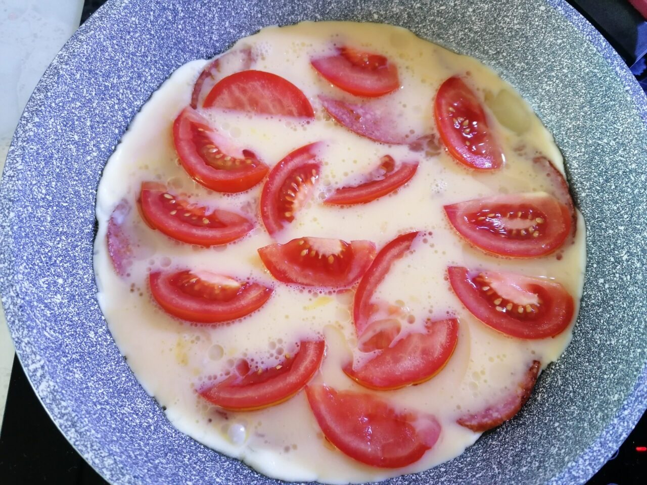 - Se spală roșia și se taie în cercuri sau semicercuri. Dupa ce s-a prajit putin cervelatul, turnati ouale si laptele deasupra. Distribuiți roșia deasupra.