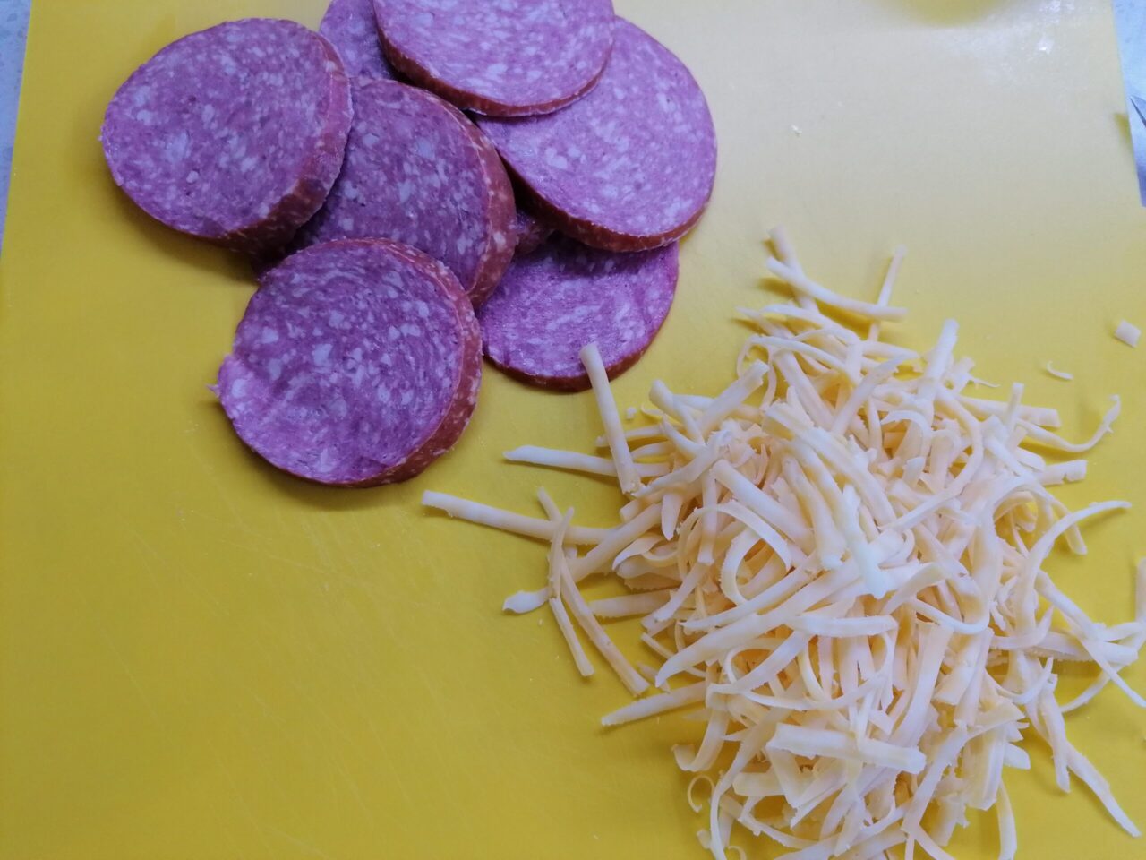 - Tăiați Servelatul în cercuri sau semicercuri, după preferință. Trei brânzeturi pe răzătoarea grosieră.