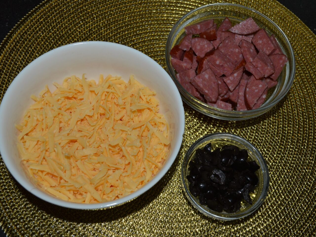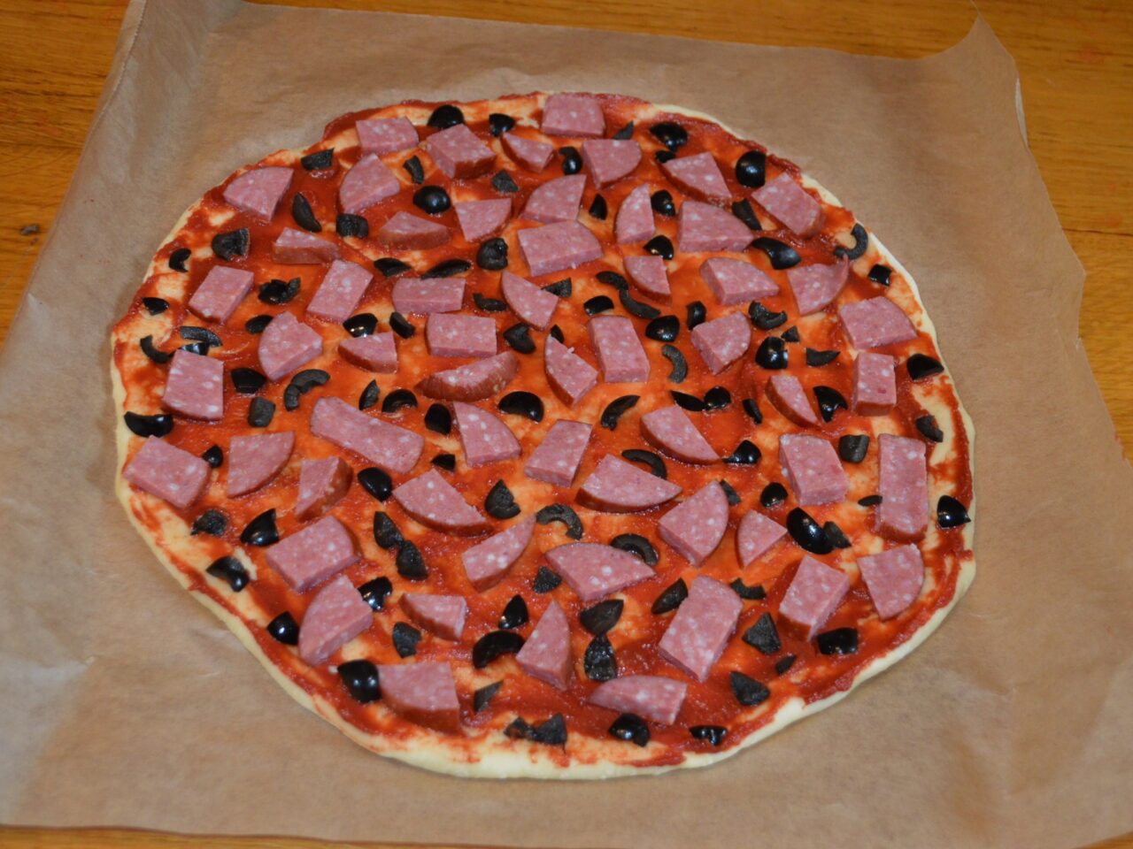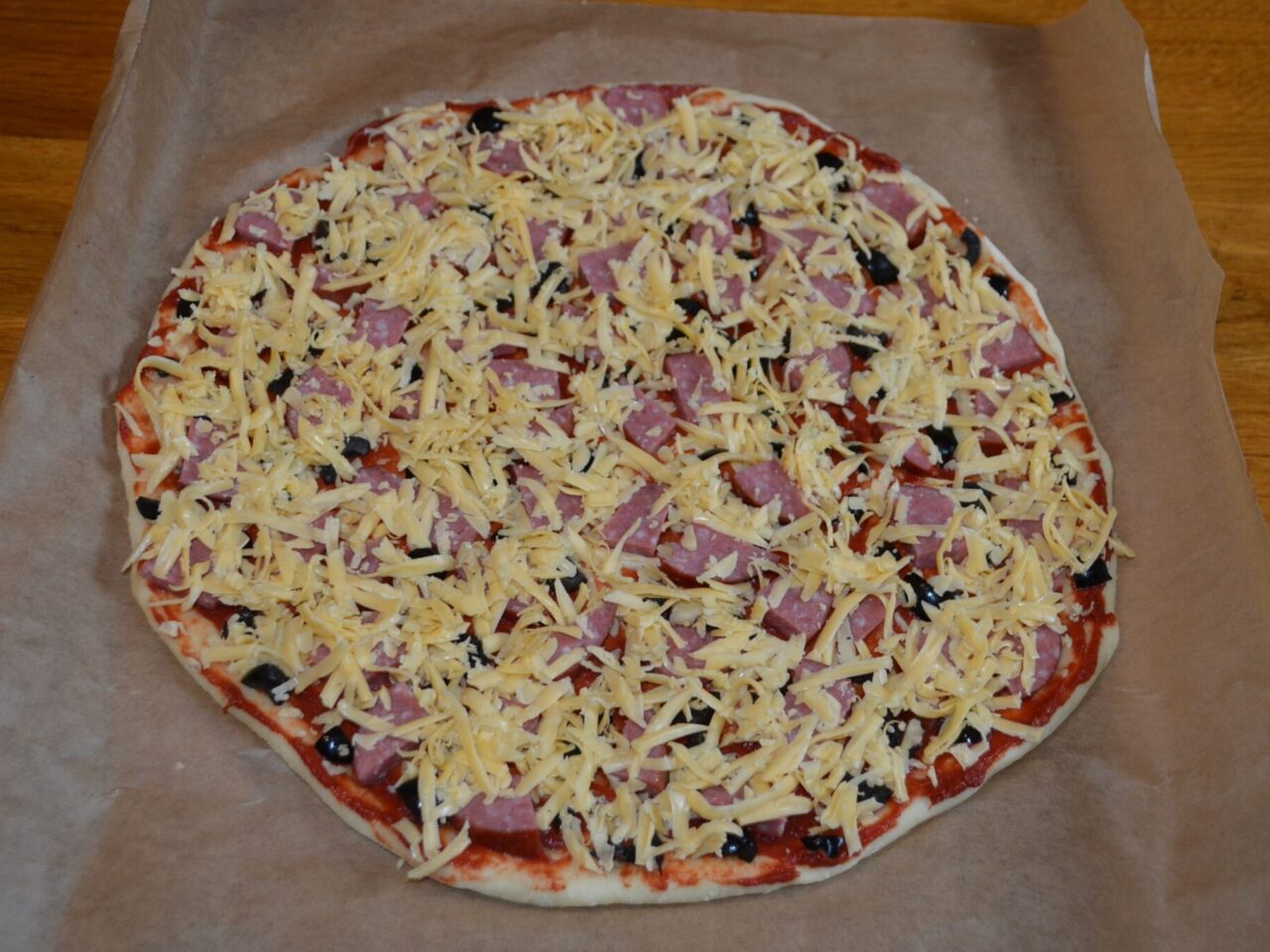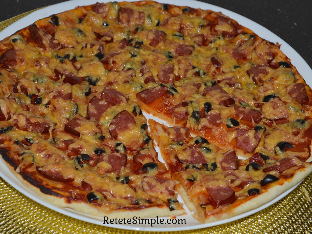 - Pregatiti ingredientele pe care doriti sa le adaugati in pizza, puteti folosi orice alte produse, spre exemplu : rosii, ciuperci, ardei, carne de pui, creveti, etc. Eu am folosit masline taiate marunt, salam servelat taiat, si cascaval tare dat pe razatoare.