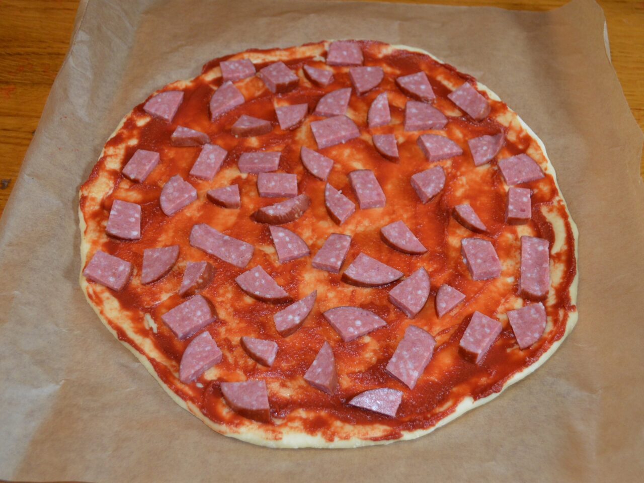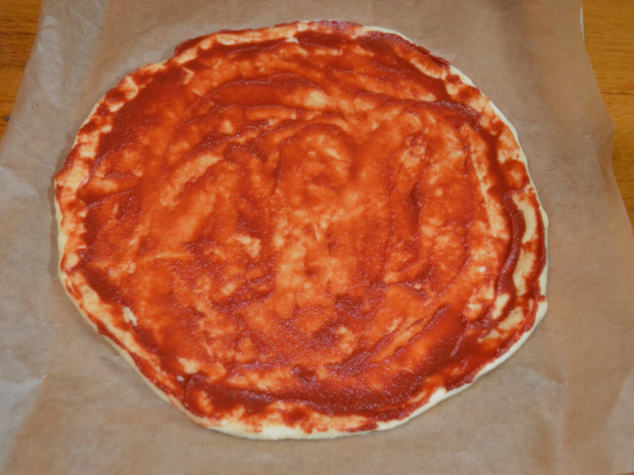 - Pentru a fi mai usor la final de transferat pizza in tava de copt, puneti de la inceput hartie de copt sub aluatul de pizza. Ungeti aluatul cu pasta de tomate.