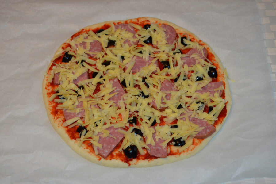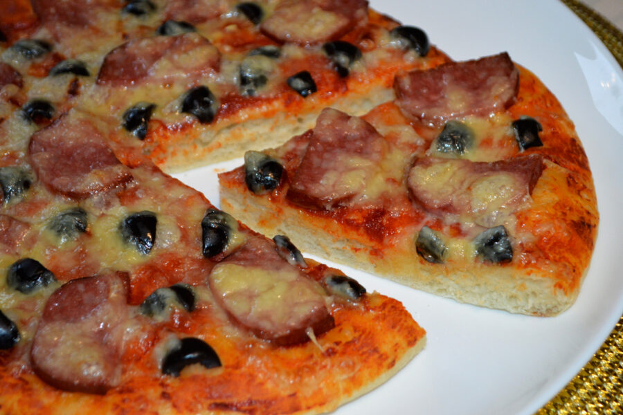 Pizza de casa cu blat pufos si cu umplutura de salam, masline si cascaval din aluat pe baza de apa. Aceasta reteta de pizza este foarte usoara si rapida, iar umplutura o puteti modifica in functie de gustul dvs., puteti adauga ciuperci, rosii, ardei gras, etc.