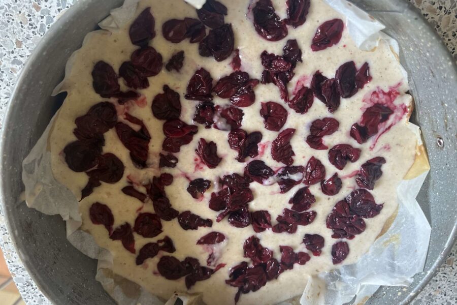 - Tapetati tava cu hartie de copt. Turnati aluatul in forma si puneti visinele deasupra.