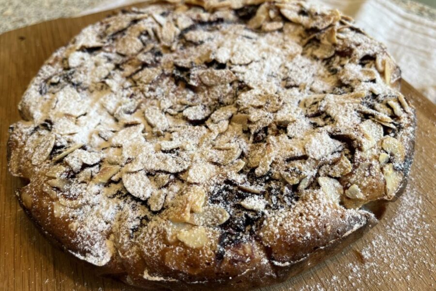 - Am înecat câteva din vișine în aluat. Blatul l-am presarat cu frunze de migdale.