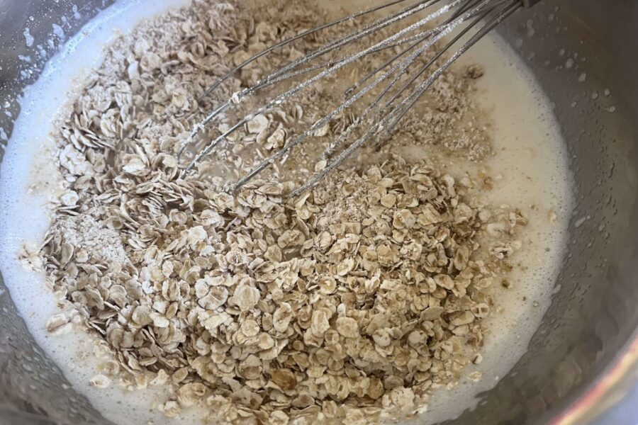 - Topiți untul și răciți. Adăugați untul, uleiul vegetal și laptele la amestecul de ouă. Am amestecat cu un tel. Toc jumătate din fulgi de ovăz în făină.