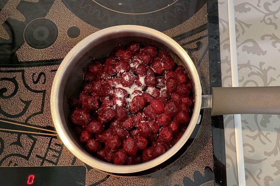 - Se toarnă cireșele într-o cratiță. Se pun la foc mediu. Când cireșele clocotesc, adăugați stevia și jumătate din amidon. Gătiți timp de trei minute și luați de pe foc.
