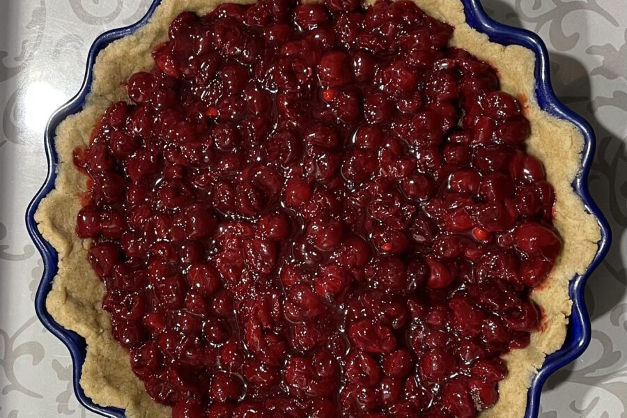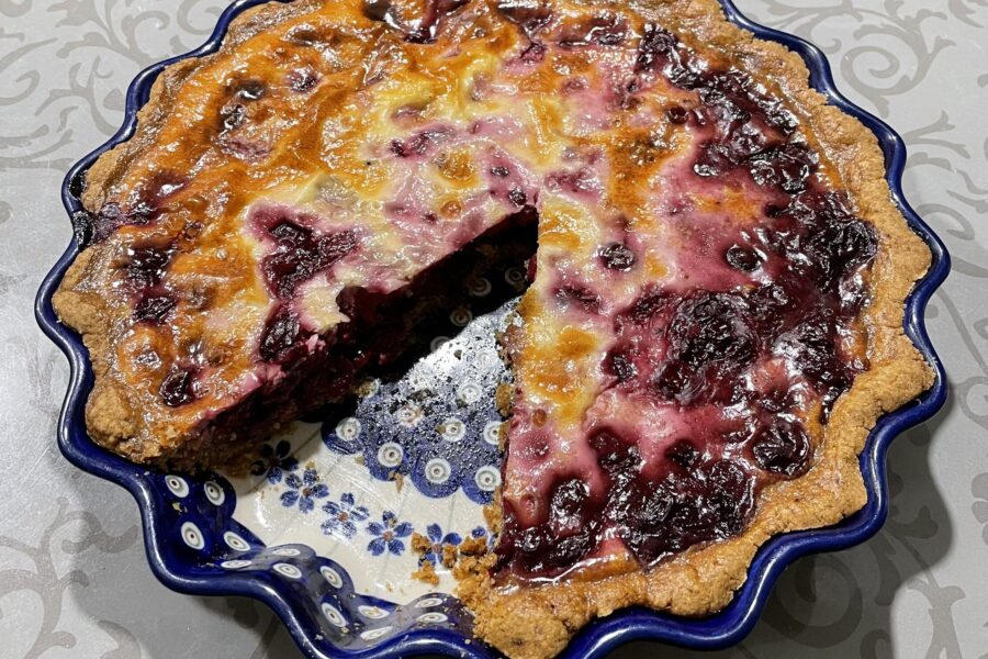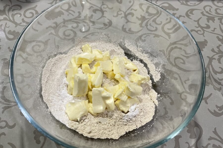 - În timp ce cireșele se răcesc, se frământă aluatul. Se amestecă într-un bol cele două tipuri de făină, praful de copt și praful de stevia. Tăiați untul rece în cubulețe, puneți-l într-un bol și frecați-l cu mâinile în făină. Se combină cu oul.