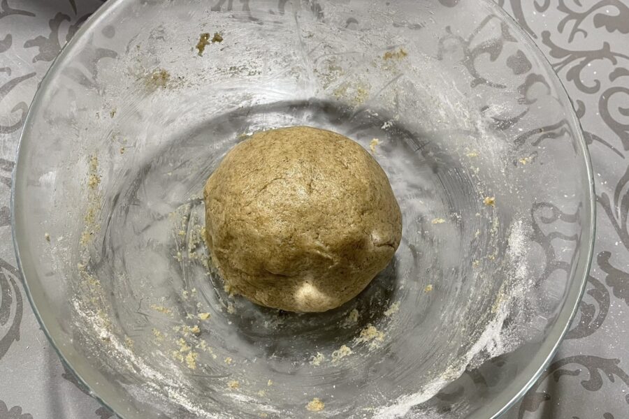 - Faceți o bilă din aluat. Nu-l răsuciți prea mult! Se acoperă cu folie alimentară și se pune la congelator timp de 10 minute. Lucrați repede pentru ca untul să nu aibă timp să se topească.