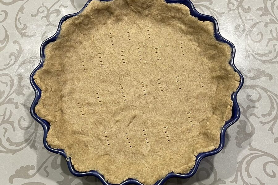 - Întindeți aluatul în formă cu mâinile pentru a forma o margine. Înțepați în mai multe locuri cu o furculiță.