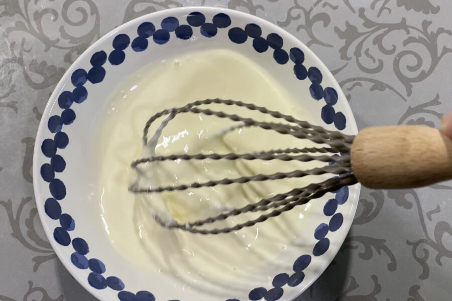 - Într-un castron, se bat împreună cele două ouă, smântâna și amidonul rămas.