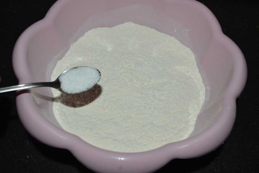 - Intre timp, pregatiti aluatul. Turnati faina intr-un bol, si adaugati o lingurita de sare.