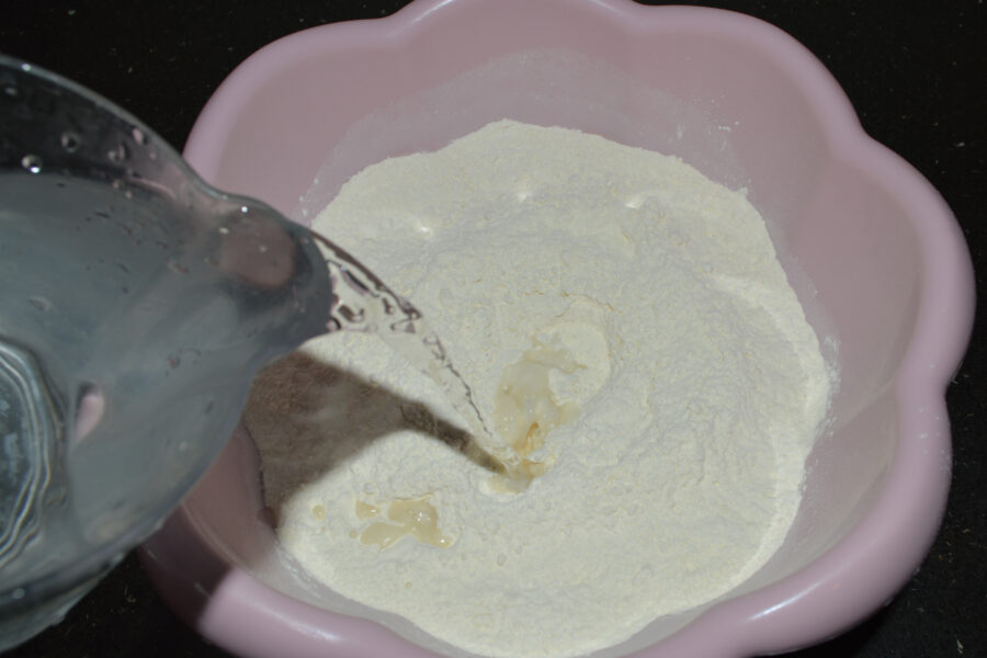 - Turnati apa calda. Framantati aluatul cu mainele.