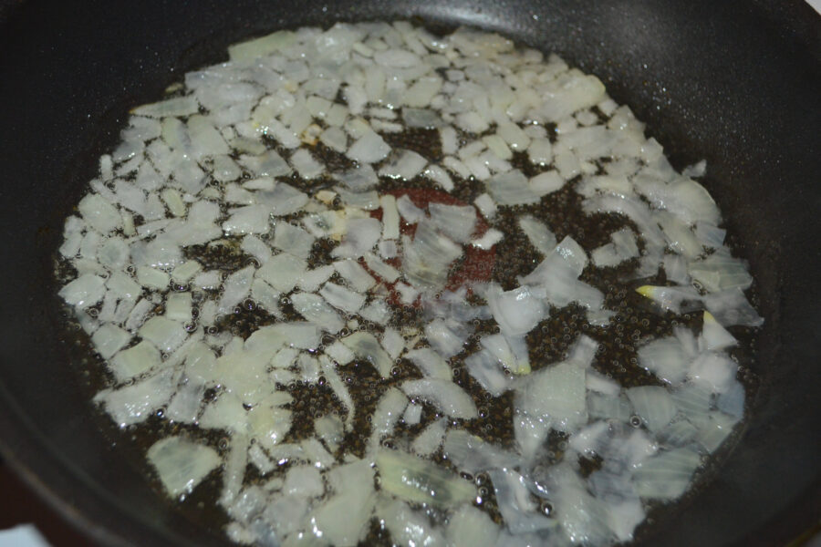 - Pregatiti umplutura pentru placinte: prajiti ceapa intr-o tigaie cu ulei incins, la foc mic.