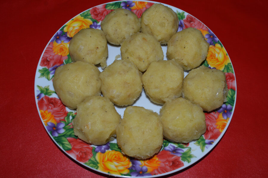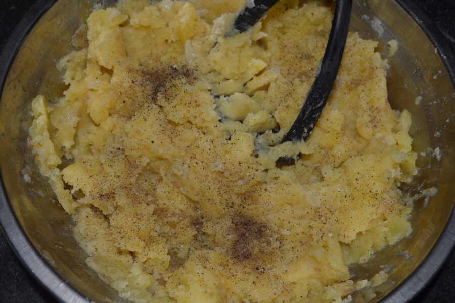 - Dupa ce cartofii au fiert, ii curatati de coaja, si ii pasati cu presa de piure. Adaugati ceapa prajita la cartofi, sare si piper negru macinat.