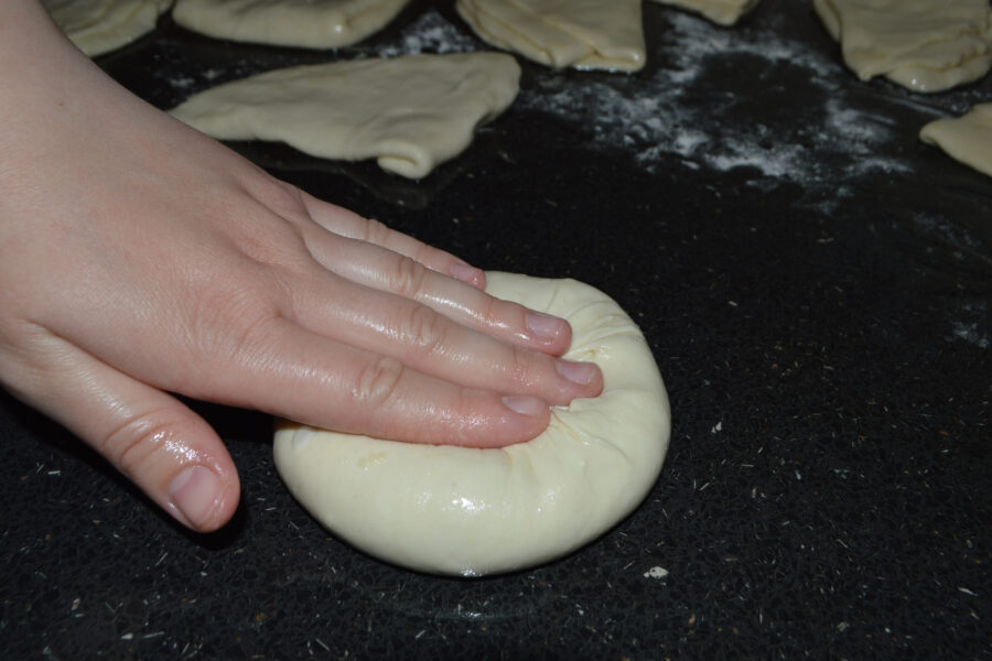 - Presati putin aluatul cu mainele, si puneti la mijloc o bila de cartofi.