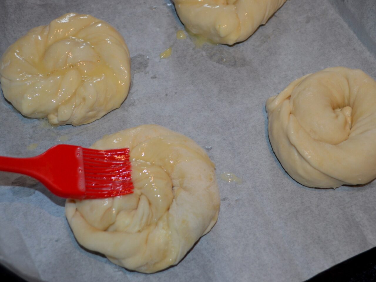 - Bateti un ou, si ungeti cu o perie de bucatarie placintele transferate pe o hartie de copt in tava.