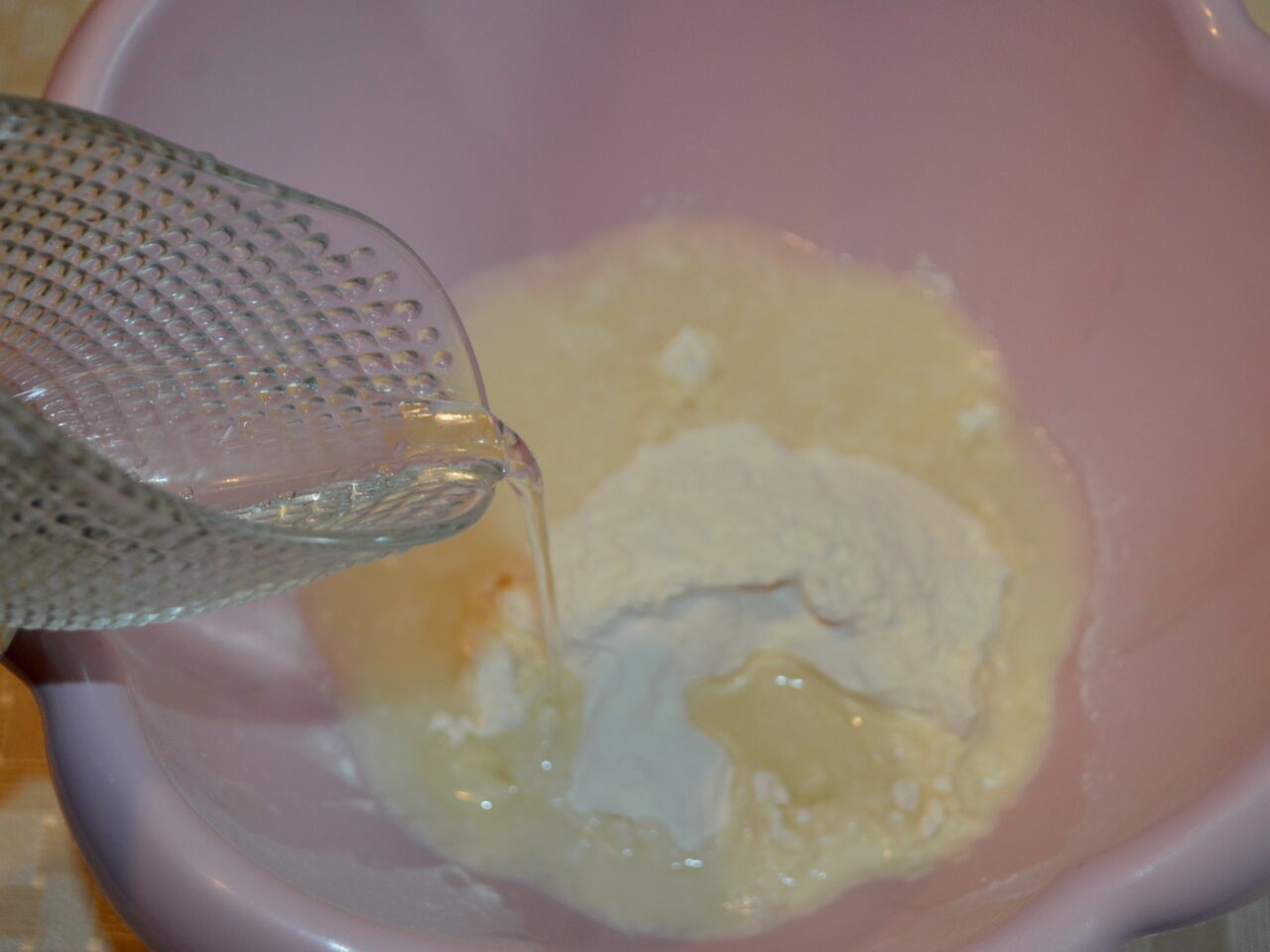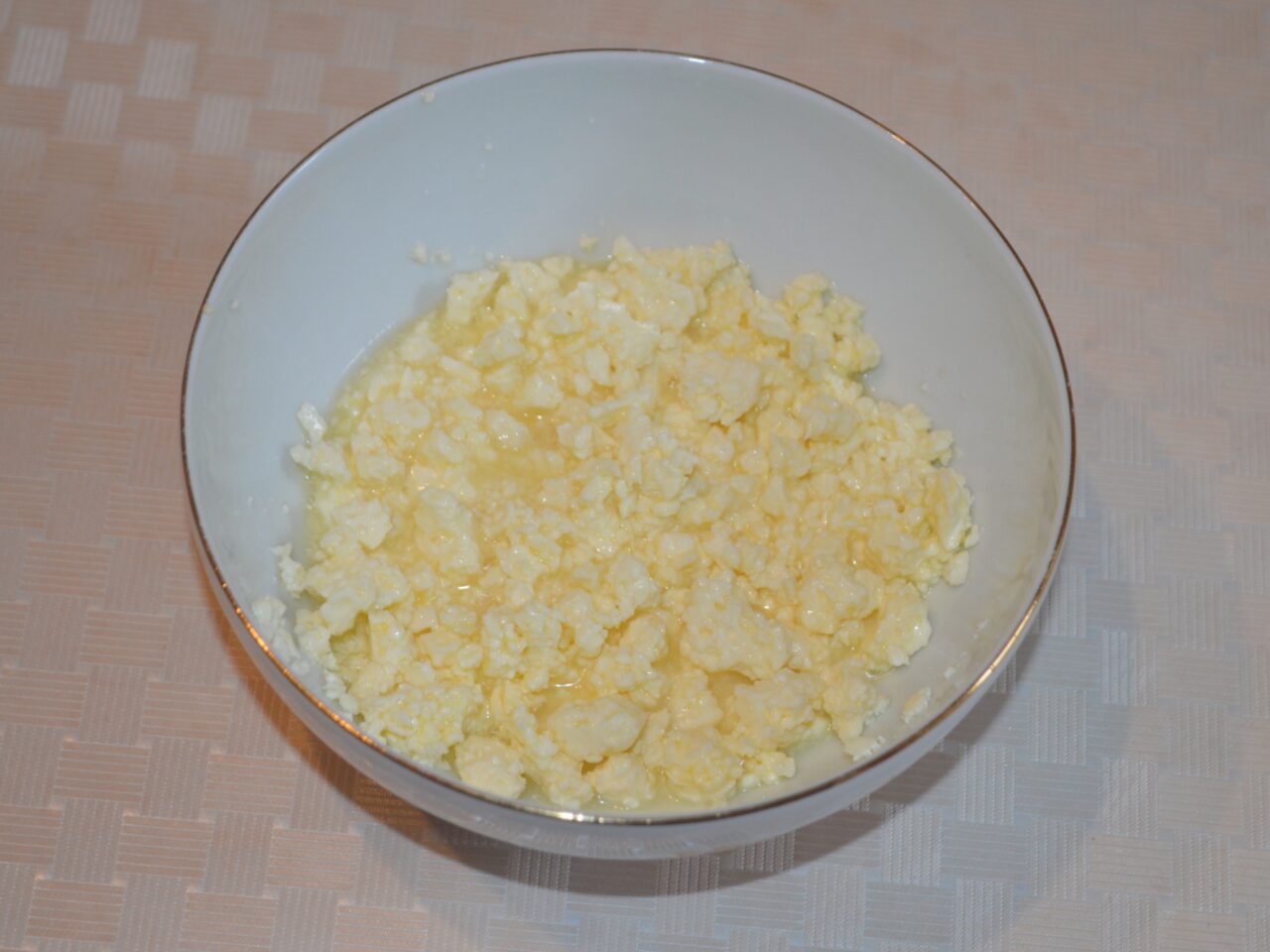 - Preparati umplutura: adaugati un ou la branza, si amestecati. Eu am folosit branza sarata telemea, dar puteti folosi si branza de vaci.