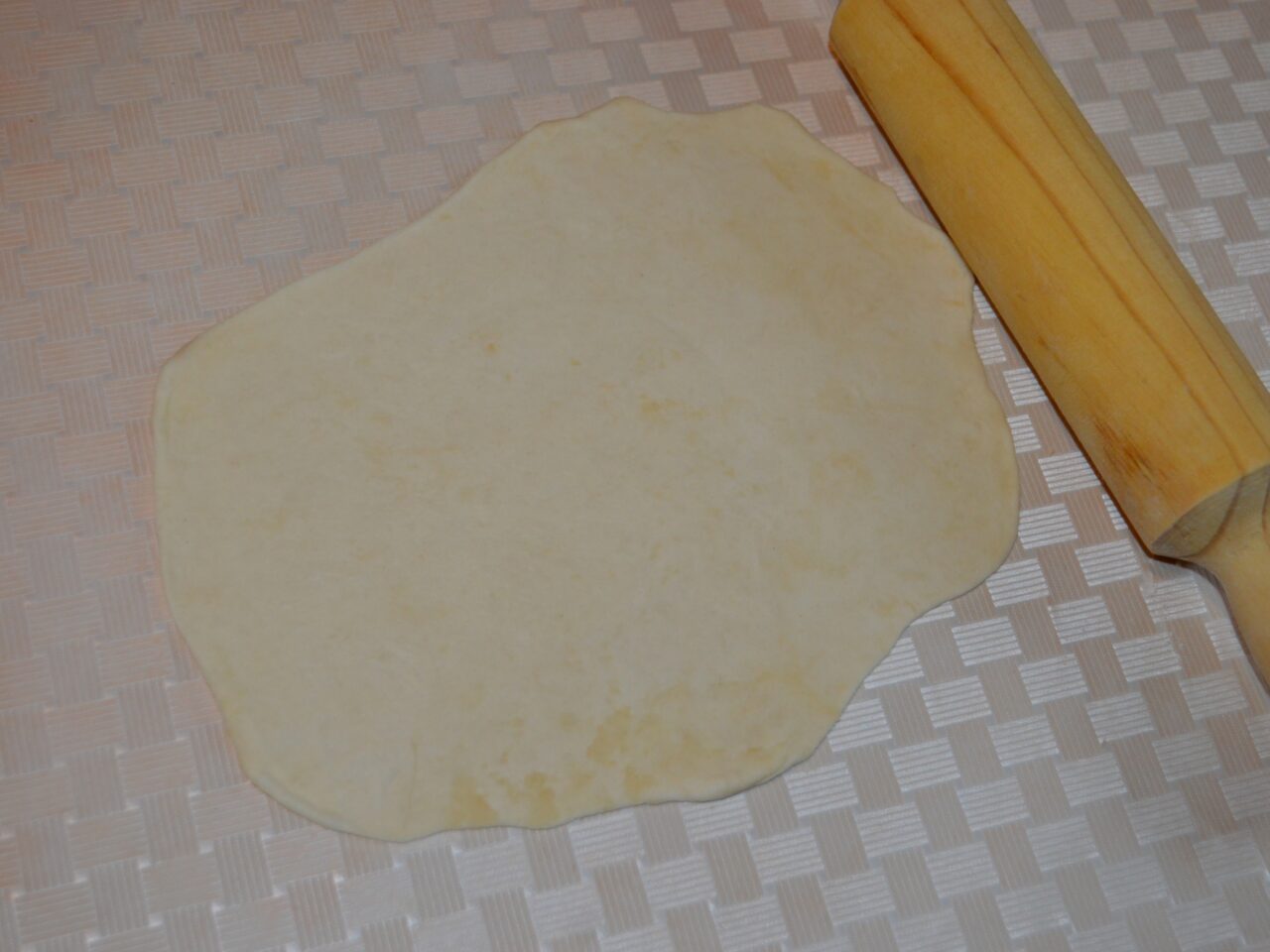 - Impartiti bila de aluat in 4 parti egale, si intindeti cu sucitorul fiecare parte de aluat in forma ovala.