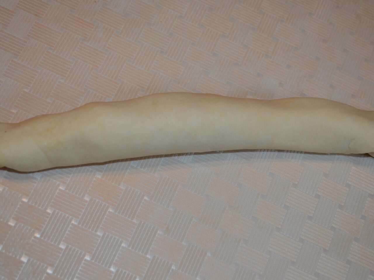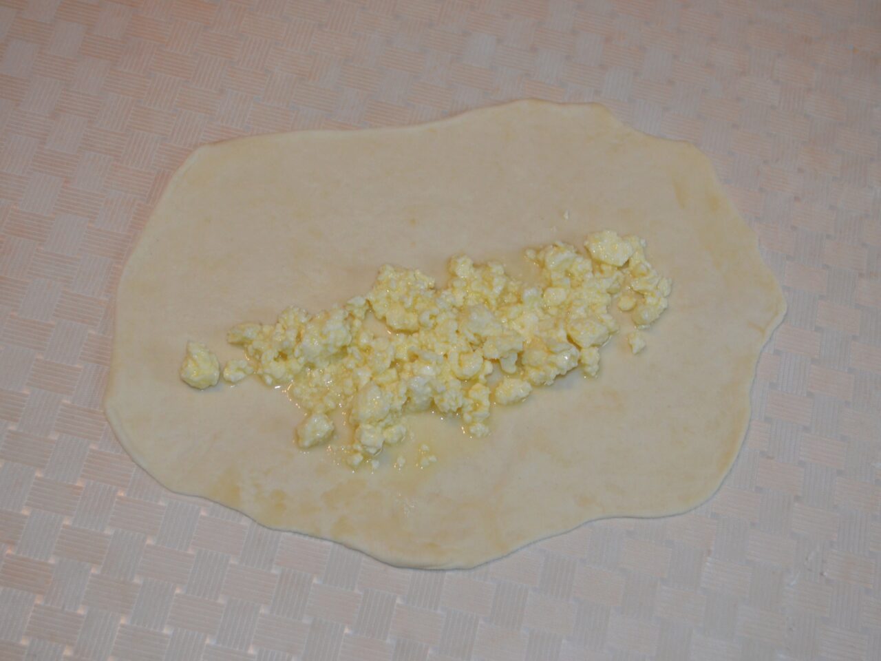 - Puneti cate 2 linguri de umplutura de branza in centrul aluatului intins, de-a lungul ovalului.