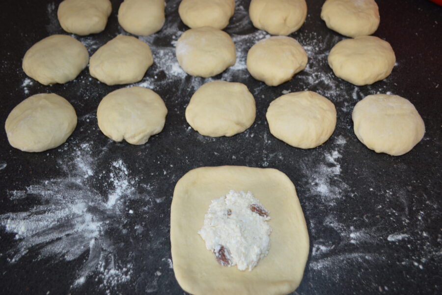 - Se pregateste umplutura : la branza de vaci se adauga oul, zaharul si stafidele, se amesteca bine. (Stafidele se inmoiae in apa clocotita pentru 15 minute, apoi se scurg.)