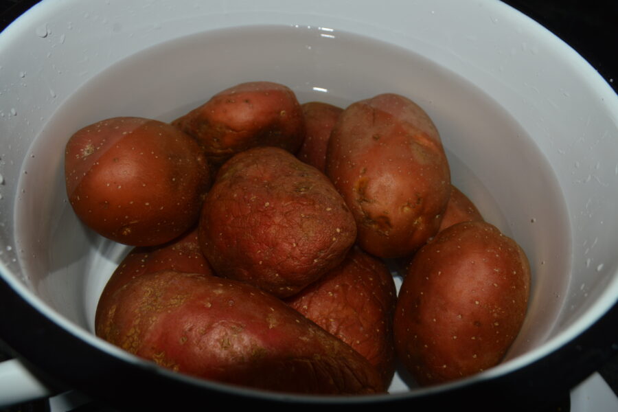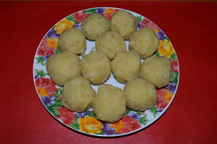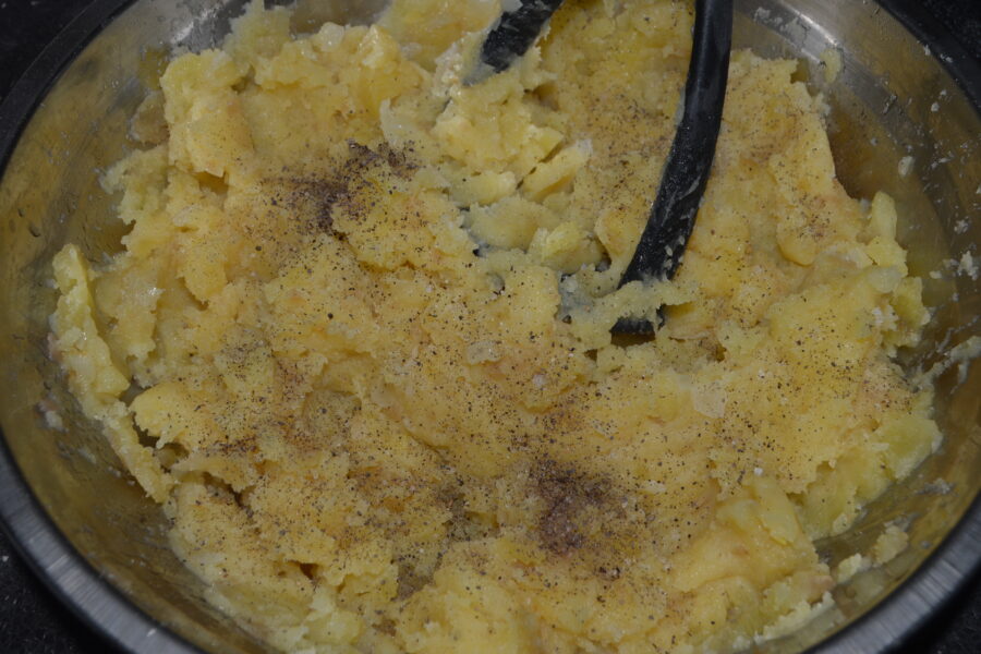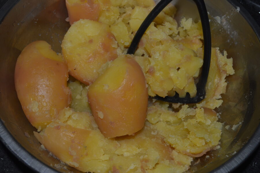 - Dupa ce au fiert cartofii ii clatiti asa fierbinti cu apa rece de doua ori, si ii curatati de coaja. Ii pasati cu presa de piure.