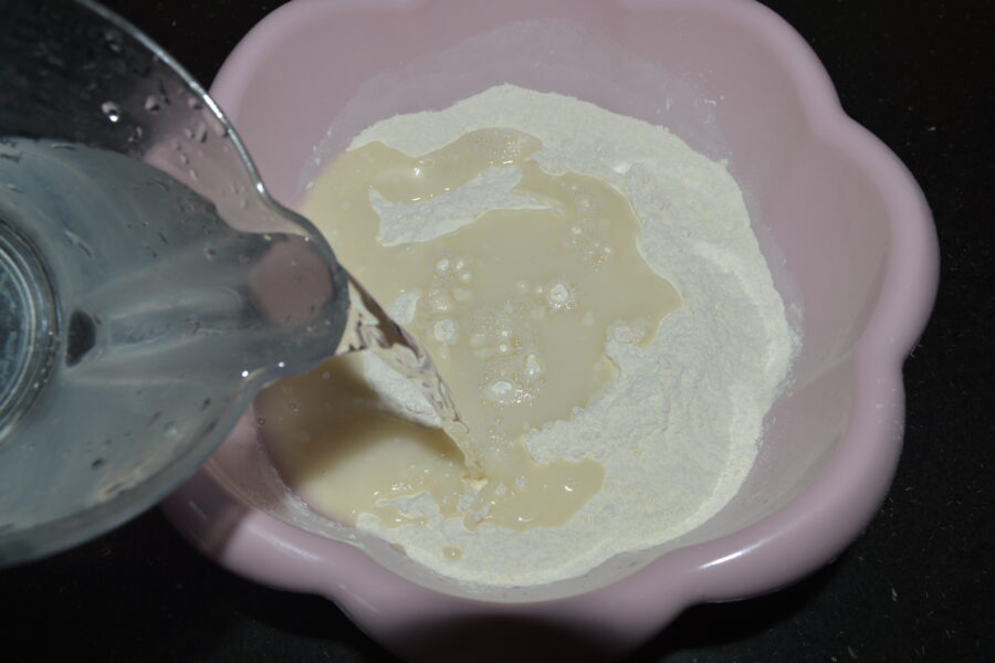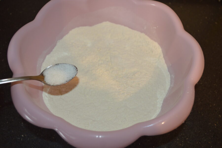- Pana cartofii fierb, o sa facem aluatul. Intr-un bol adaugati faina, si o lingurita de sare.