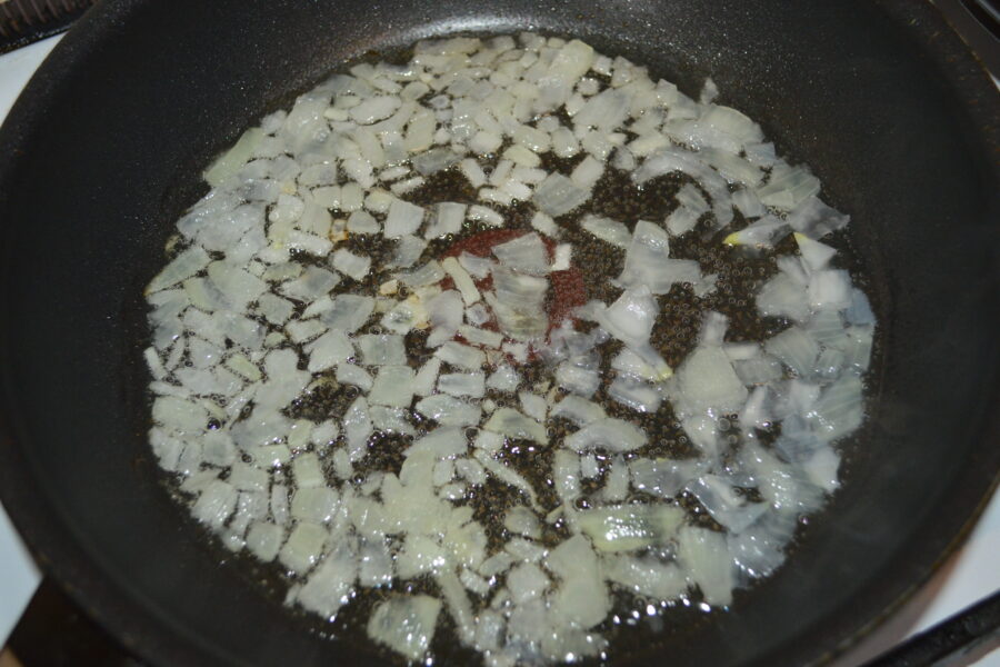 - Intre timp, taiati si prajiti ceapa intr-o tigaie cu ulei incins, la foc mic.