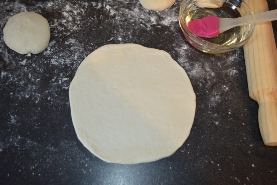 - Folositi un facalet pentru a intinde bilele de aluat, si le ungeti cu ulei.