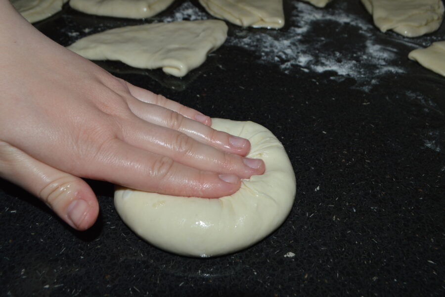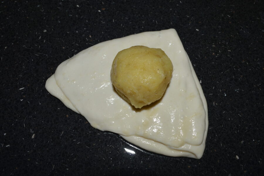 - Presati usor cu mainele aluatul, si puneti o bila de cartofi.