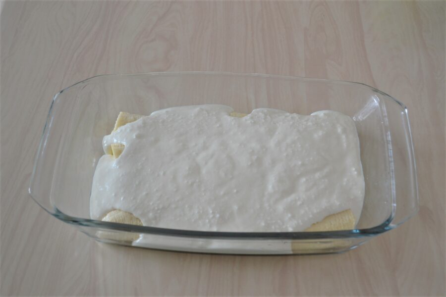 - Se toarnă cu grijă amestecul preparat de branza și chefir peste banane.