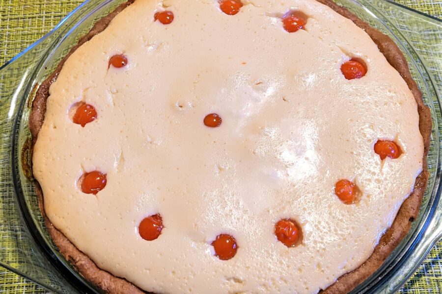 - Împărțiți aluatul în formă, umpleți-l cu masă de caș și decorați cu boabe physalis de . În loc de physalis, puteți pune felii de ananas, piersici sau orice fructe de pădure.