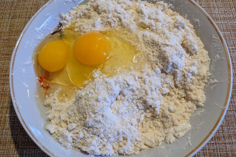 - Bateți ouăle și frământați rapid aluatul. Înveliți aluatul în folie și puneți-l la frigider pentru cel puțin 30 de minute.