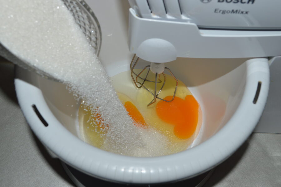 - Puneti intr-un bol ouale si zaharul, si bateti cu mixerul.