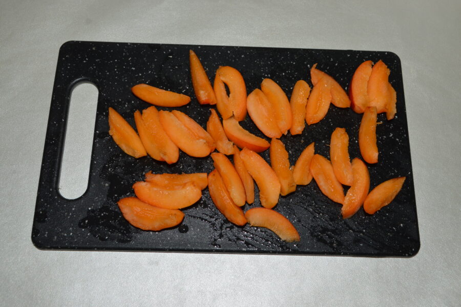 - Taiati cele 3 caise ramase in felii lungi, pentru a decora prajitura.