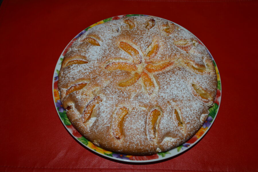 - Turnati aluatul intr-o forma de copt cu diametrul de 19-20 de cm, asterneti dedesubt un cerc din hartie de copt, apoi asezati caisele pe suprafata aluatului. Dati la cuptorul preincalzit la 180 de grade C, timp de 35-40 de minute. Va orientati dupa cuptorul dvs, puteti face testul scobitorii sa verificati daca este gata (daca dupa ce scoateti scobitoarea va fi uscata inseamna ca este gata).