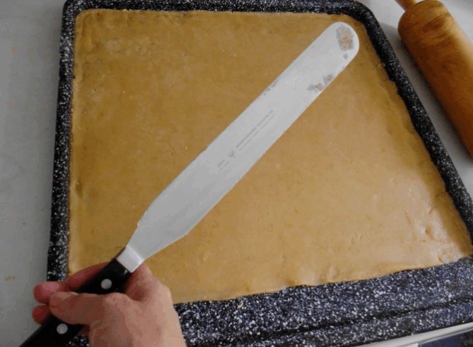 - Așezați aluatul pe o tavă de copt cu făină și apoi întindeți-l până când aluatul este distribuit uniform pe toată tava de copt.