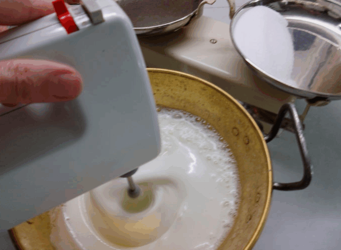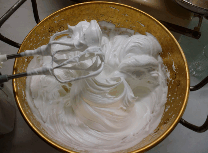 - Albusurile se bat usor spuma cu un mixer, apoi se adauga 3 linguri de apa si treptat zaharul (nu toate odata, pentru ca sa absoarba mai bine zaharul).