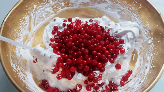 - Se amestecă până când bezeaua ajunge la consistența dorită, fermă. Îndoiți ușor coacăzele în bezea.