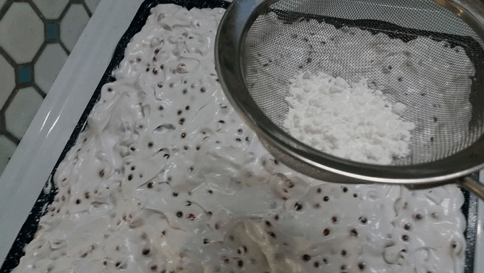 - Presărați zahăr pudră deasupra și puneți din nou la cuptor pe grătarul din mijloc. Lăsați bezeaua să se usuce încet. Reduceți temperatura la aproximativ 130 de grade.