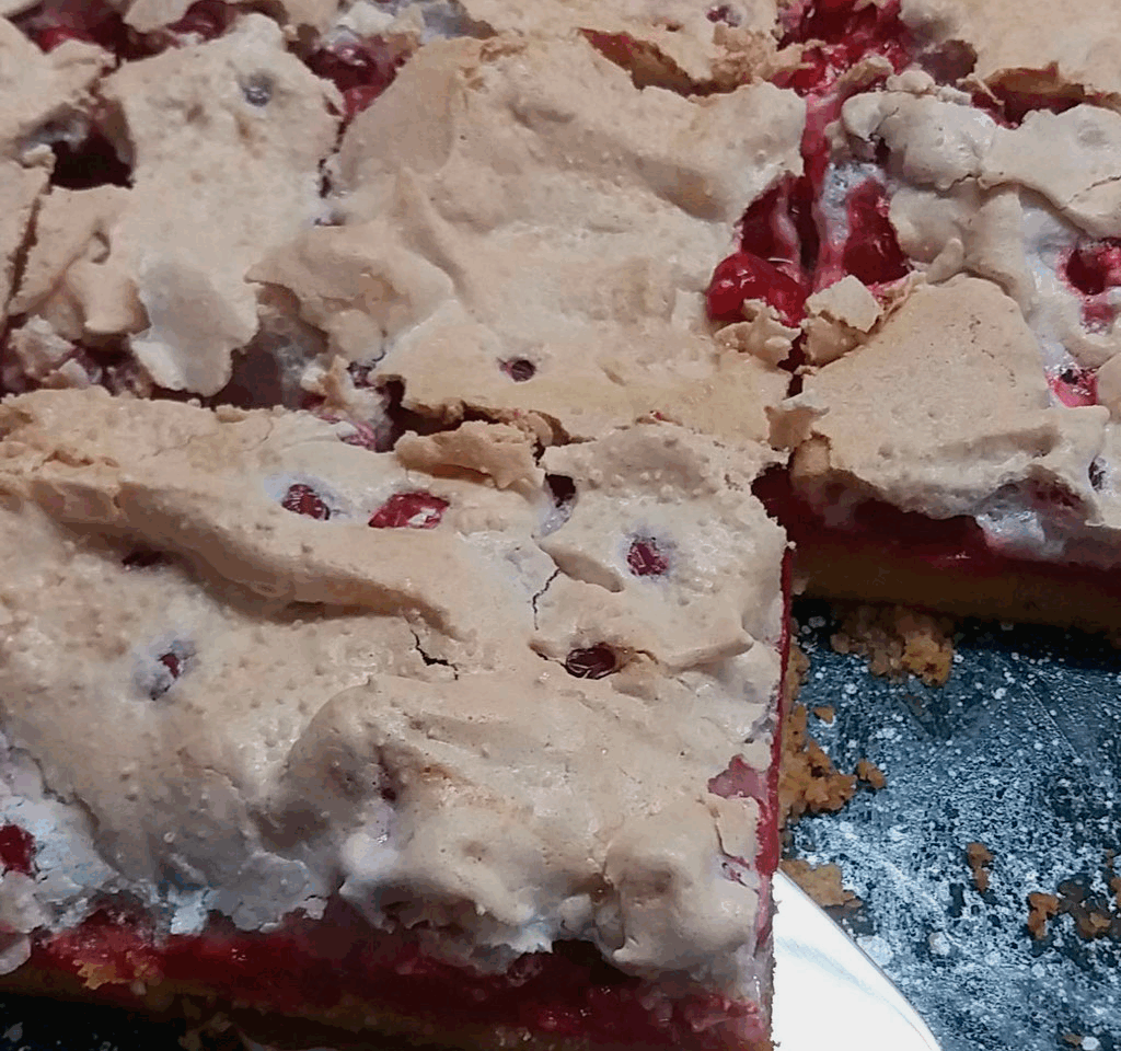 - Cand aluatul este gata (maro deschis), scoatem foaia de copt din cuptor si punem deasupra bezea de coacaze.